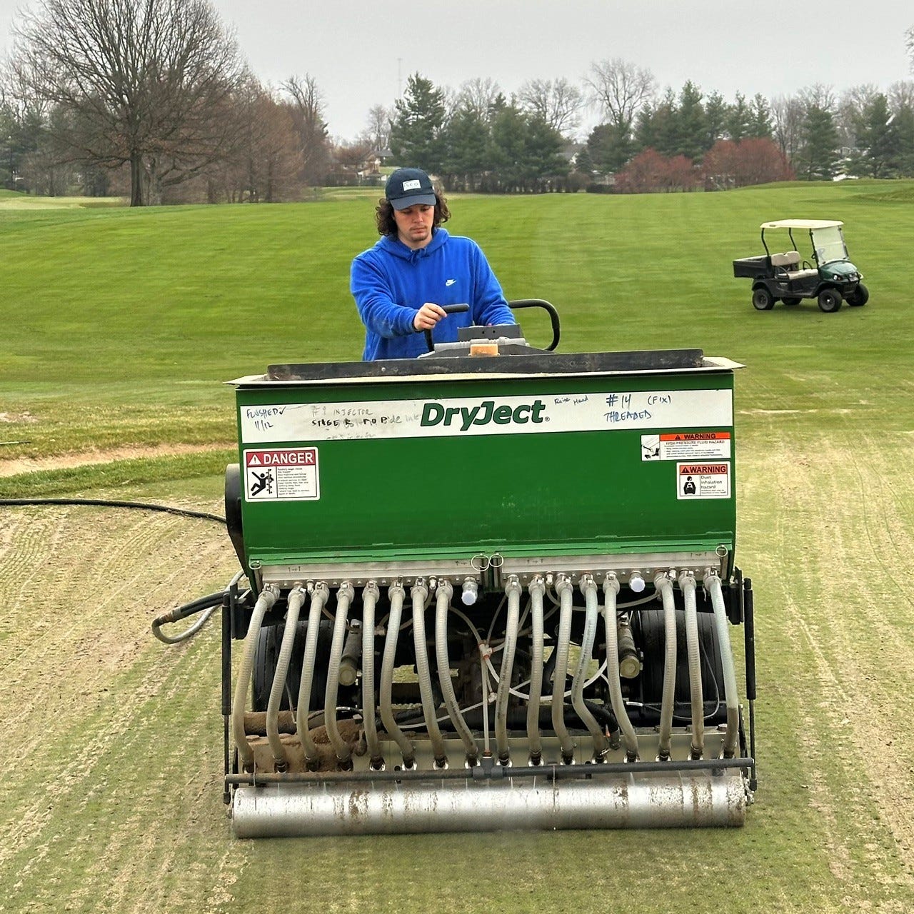 The next day Kentuckiana Turf Solutions were on hand to perform DryJect aerification to all the putting greens. Deep tine, hollow core, and DryJect in twenty-four hours is AGGRESSIVE as we strive to improve the performance of our putting surfaces with regards to water infiltration before the warm season arrives.